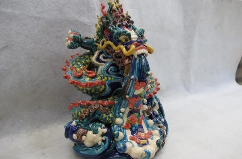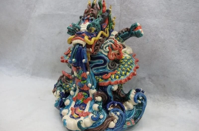Taiwan Koji Cochin pottery WuCai Colorful porcelain spit Water Dragon Art Statue